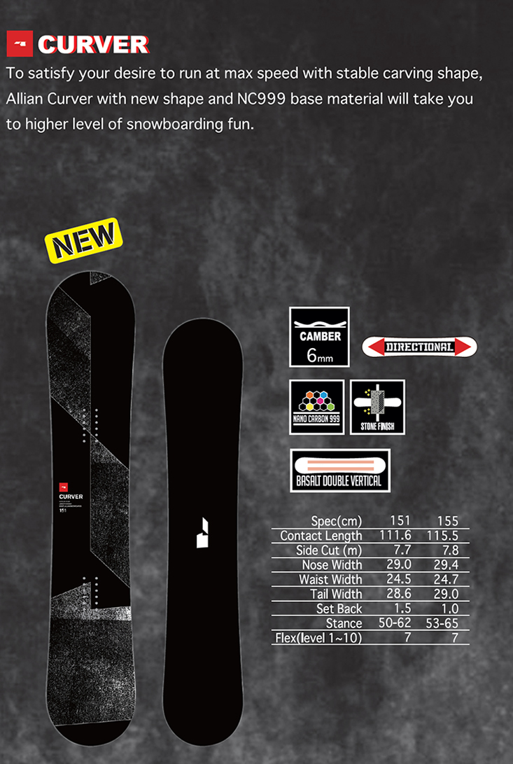 A freestyle carving board with stronger tortional flex thanks to the X pattern Basalt Fiber. The best base performance with the hardest NC999 base material used. The wider board width will ensure more stability in running at a various surface condition at high speed This board is ridden by some boarder cross competitors.